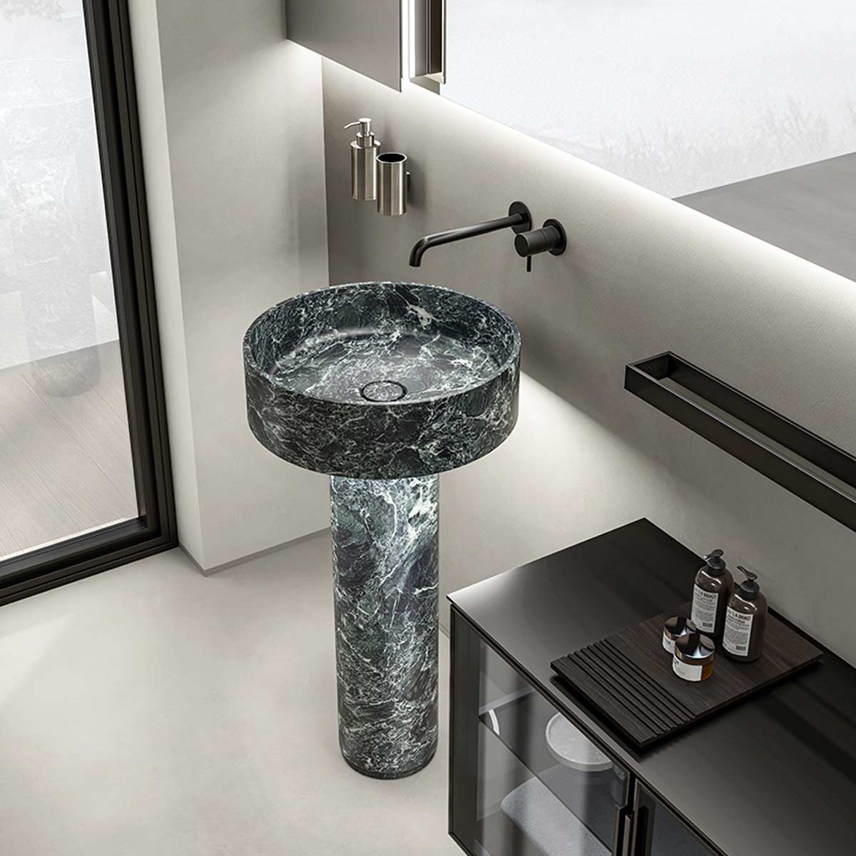Runt golvstående tvättställ av Verde alpi-marmorDesign tvättställ från Italien i marmor och med LED-ljus för fri placering på golvetLa Luce Verde golvstående tvättställ i grön marmor och badrumsskåp