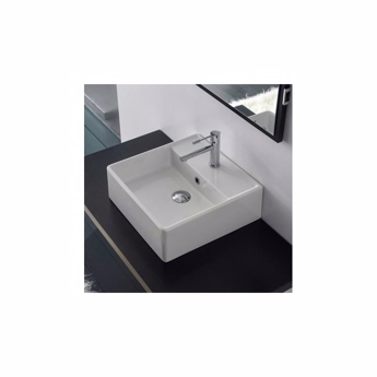 Fyrkantig tvättställ för placering på bänkskiva eller hängande på väggen.