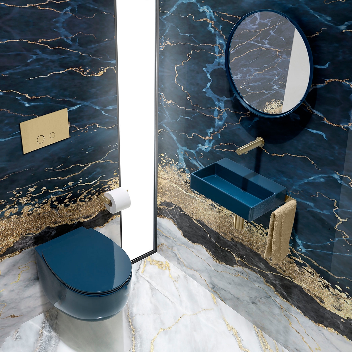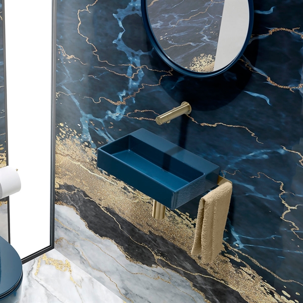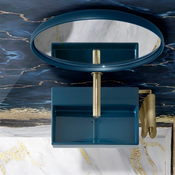 Ett mörkblått handfat ger badrummet en sofistikerad touch och fungerar som en snygg kontrast till ljusare element i harmoni med en elegant bänkskiva eller så kan det hängas på väggen. Det skapar ett unikt och modernt uttryck som ligger i linje med aktuella designtrender.