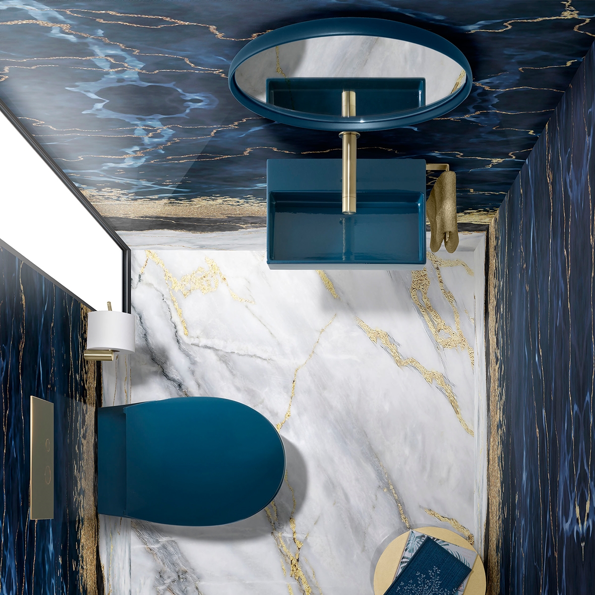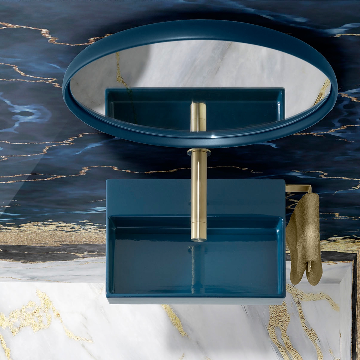Det lilla mörkblå tvättstället lyfter rummet med sin exklusiva färg och skarpa linjer, samtidigt som det inte tar upp mycket plats.