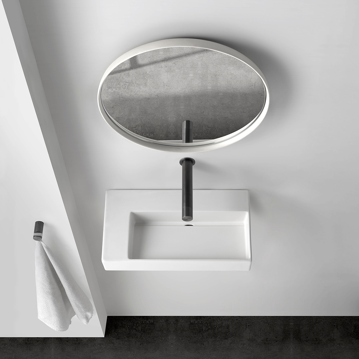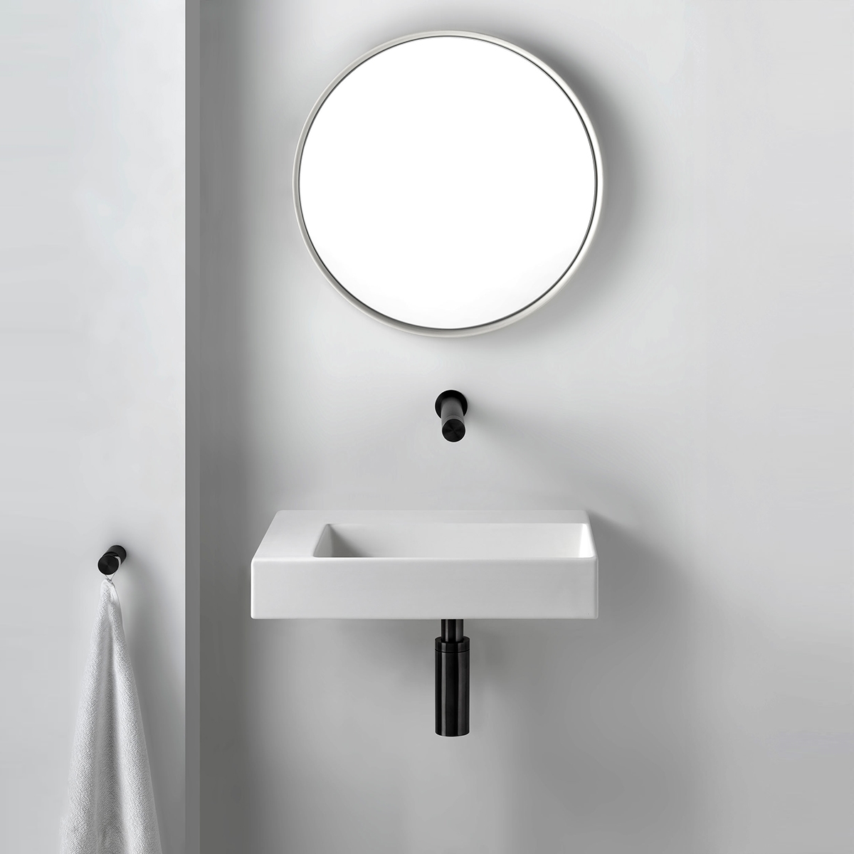 Designen är väl genomtänkt ända ner till utloppet i tvättstället, där ett dolt avlopp kompletterar den minimalistiska looken.